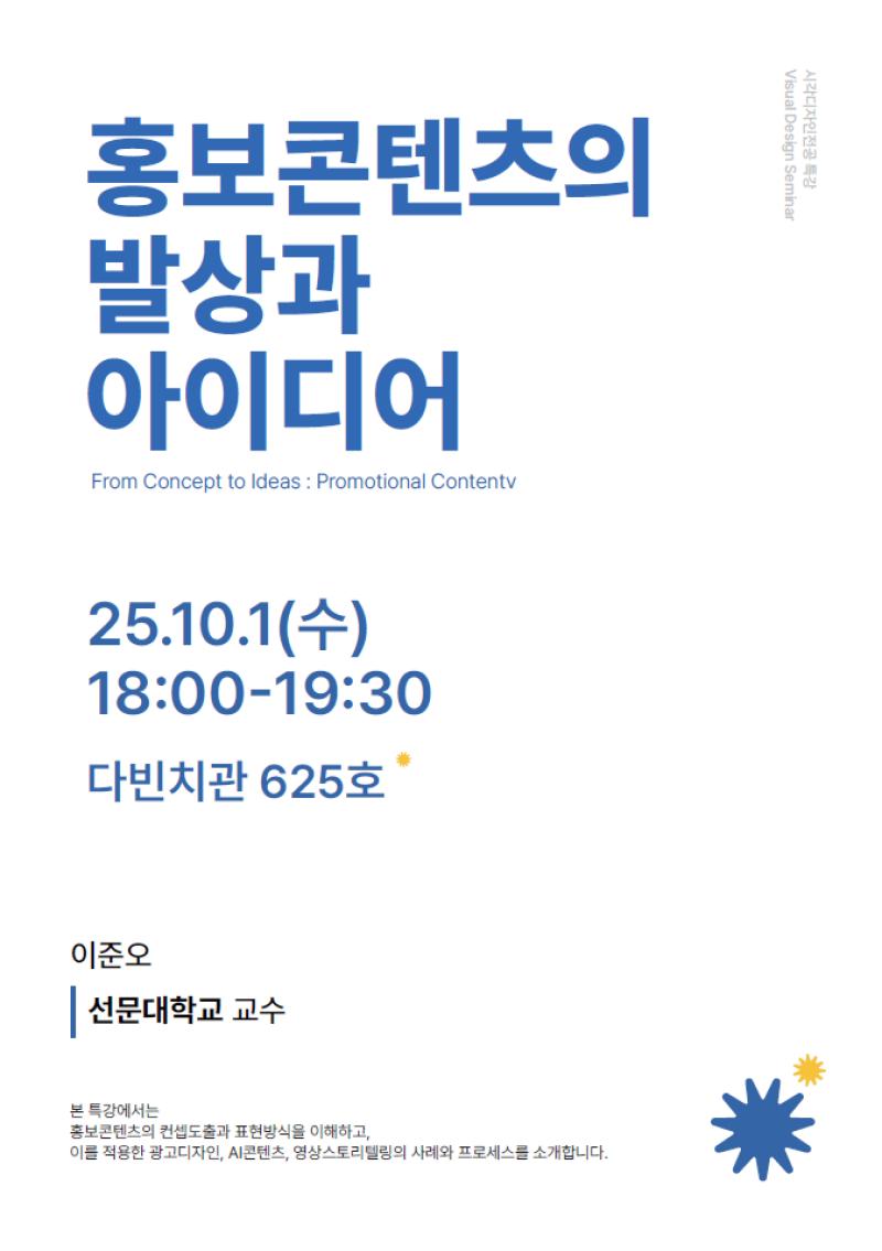 특강④ 2025년 10월 1일(수) 18:00~19:30 다빈치관 625호 특강강사: 이준오소속: 선문대학교 교수 홍보콘텐츠의 컨셉도출과 표현방식을 이해하고, ...