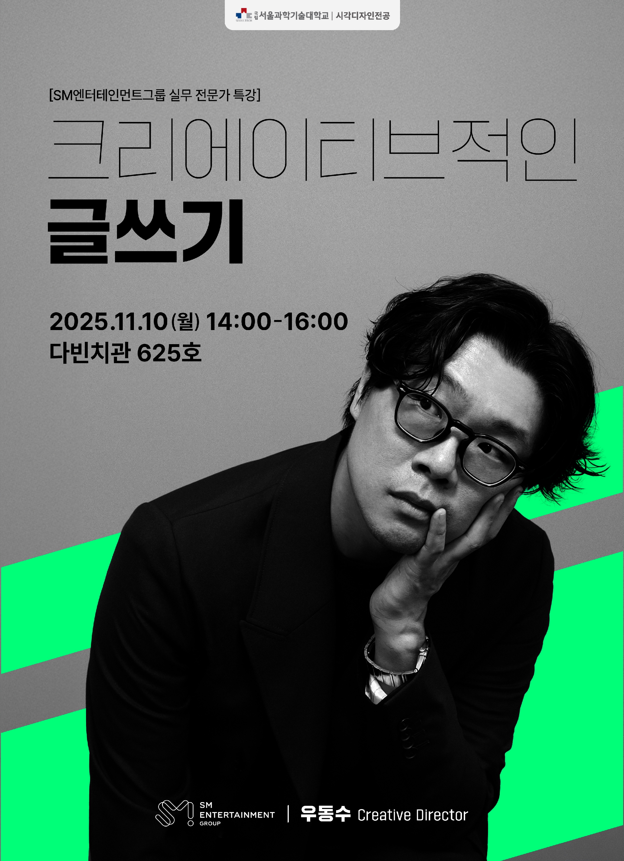| 제목 | [특강 안내] SM엔터테이먼트그룹 실무 전문가 특강 - 크리에이티브적인 글쓰기 | ||||